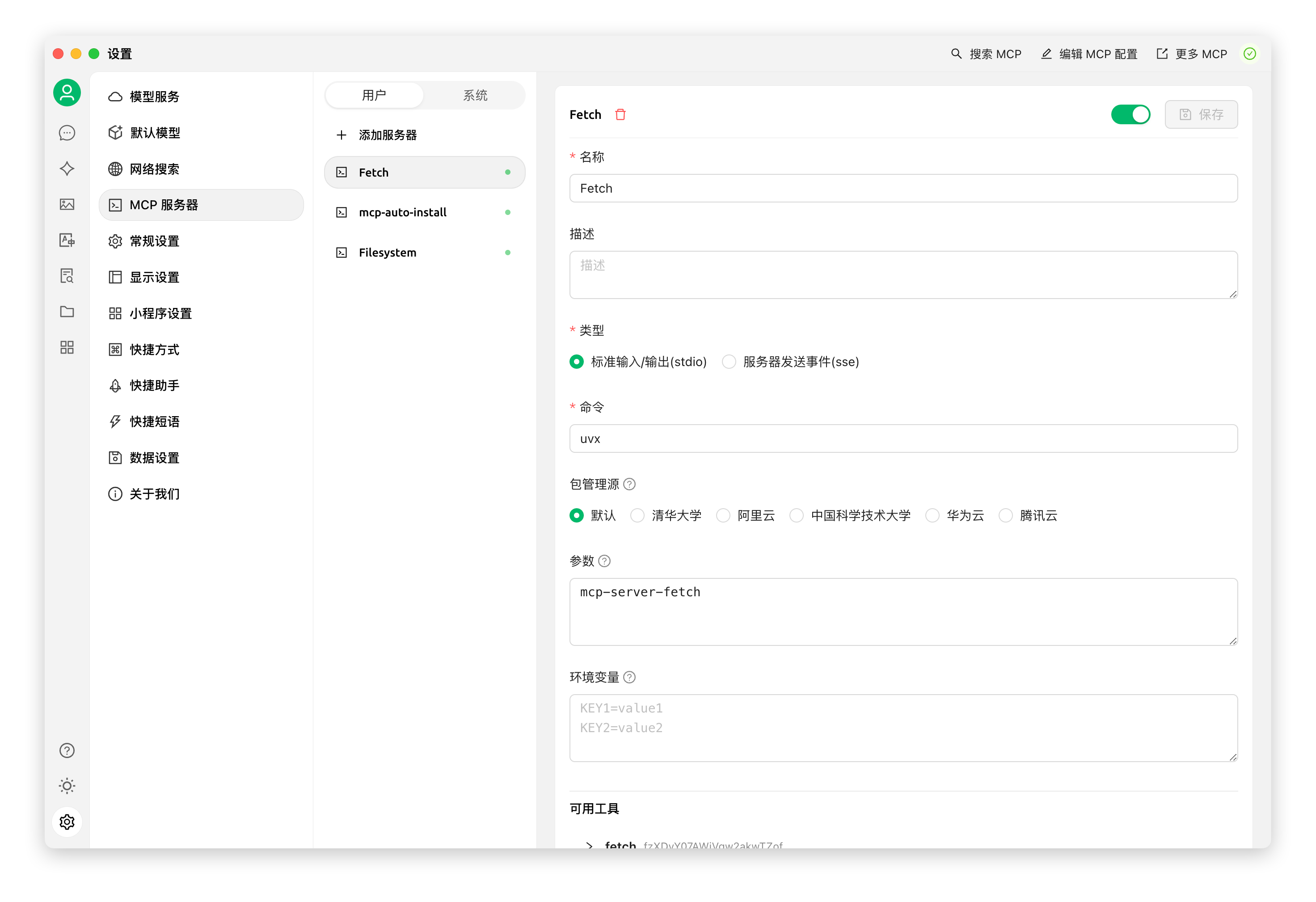 After completing the above configuration, Cherry Studio will automatically download the required MCP Server - `fetch server`. Once the download is complete, we can start using it! Note: if the mcp-server-fetch configuration is unsuccessful, you can try restarting the computer.