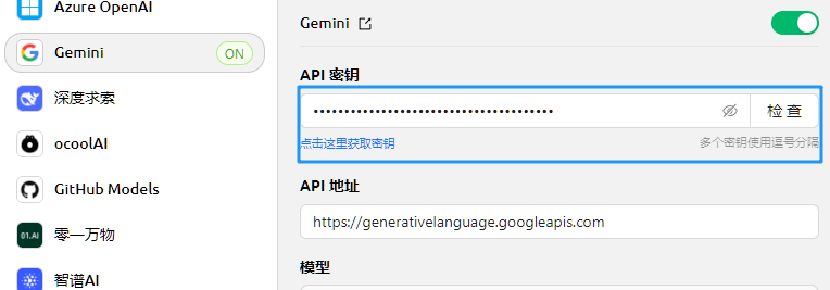 * Find the provider Gemini, and enter the key you just obtained