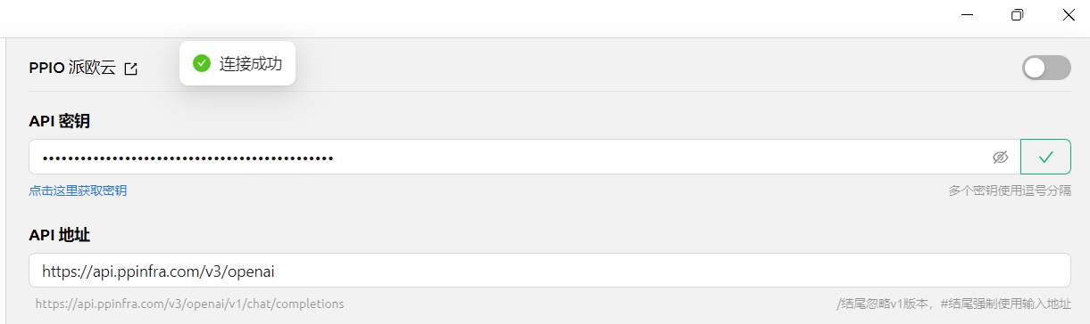(3) En Cherry Studio, ingresa la clave: Ve a Configuración, selecciona【PPIO Pi Ouyun】, ingresa la clave API generada y haz clic en【Verificar】