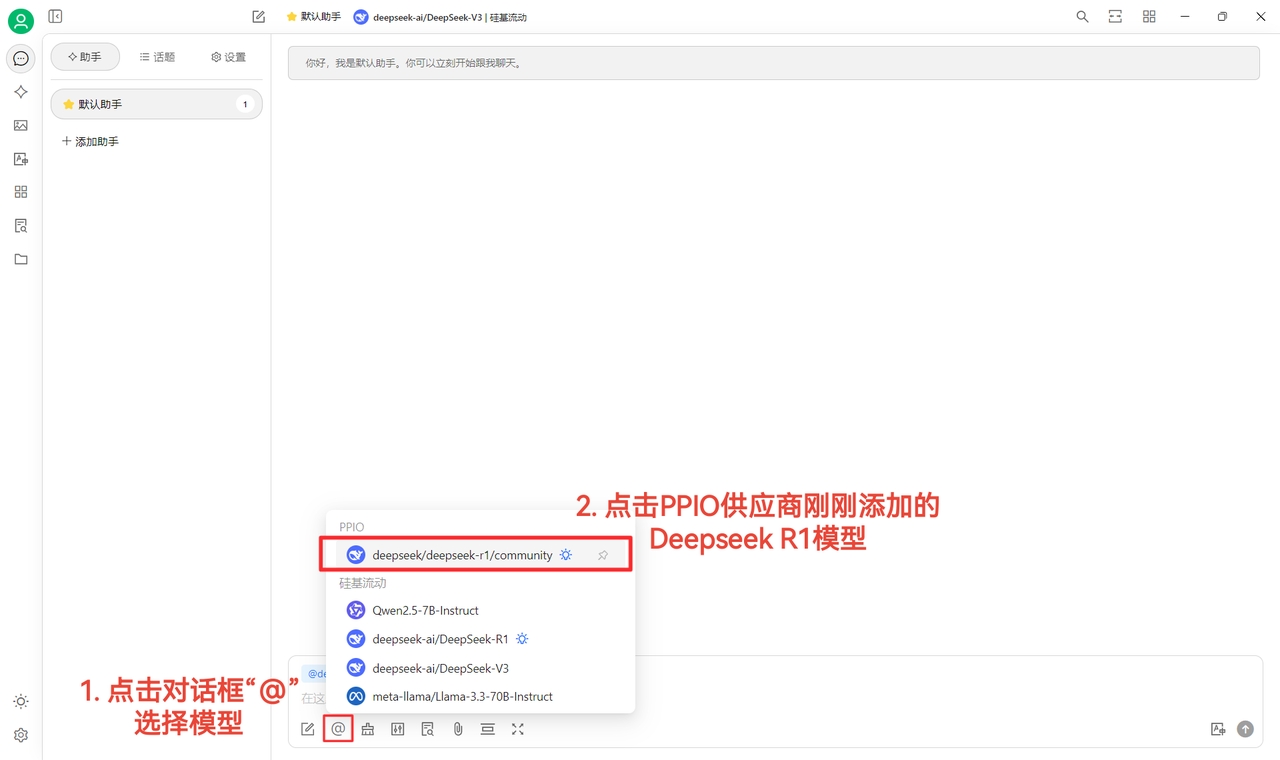 (2) Finalmente haz clic en【@】, selecciona el modelo DeepSeek R1 bajo el proveedor PPIO e inicia el chat.