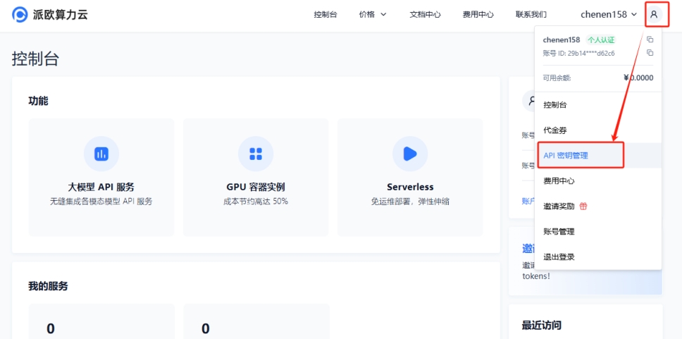 (2) Visita Gestión de claves API de PPIO, haz clic en el 【avatar de usuario】→【Gestión de claves API】para entrar al panel.