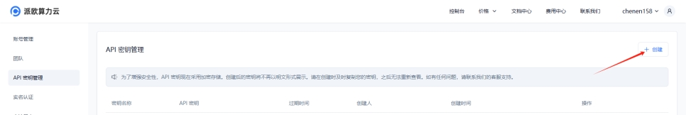 Haz clic en【+ Crear】para generar una nueva clave API. Asigna un nombre personalizado. La clave solo se muestra al generarse; cópiala y guárdala en un documento para evitar problemas futuros.